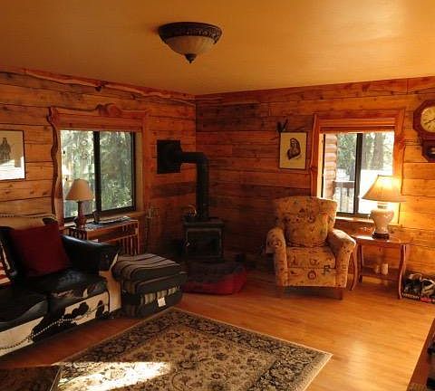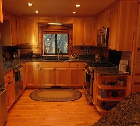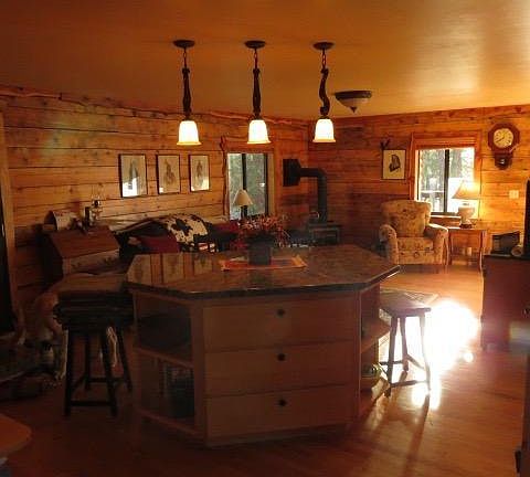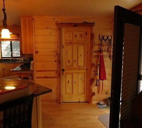 Log cabin with many unique craftsman touches. Hardwood Maple floors. Gourmet kitchen with custom built clear pine cabinets granite counter tops Knotty pine interior doors. High end gas kitchen range .Log slab window sills log railings. Central AC and forced propane heat. Soapstone wood stove .Large tree deck with views of several large pines. Covered trex front porch . Antique clawfoot tub in master bath. Metal roof. This cabin as it all. Most furnishings to covey outside of escrow.