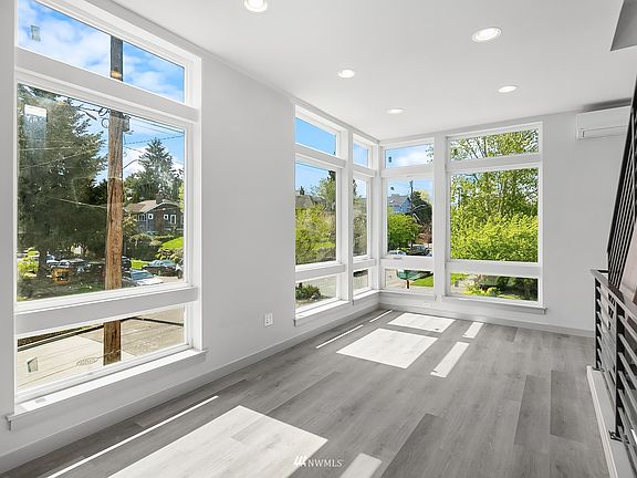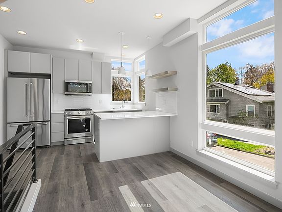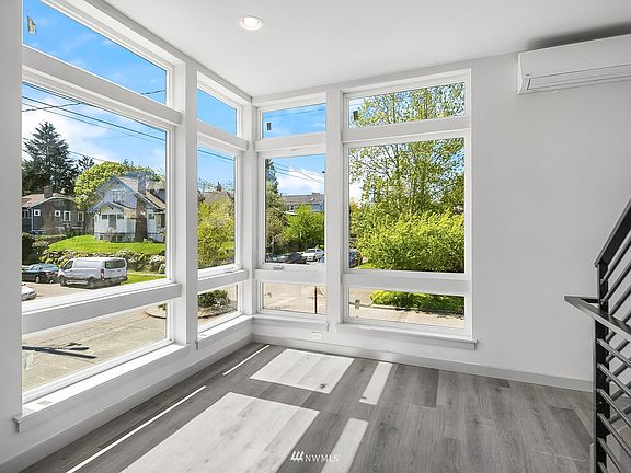 LAST REMAINING HOME! Highly sought-after SW facing corner/end new construction home nestled on a quiet residential street in Wallingford community. An abundance of natural light fills the home from wrap-around floor to ceiling windows. Boasting an eco-friendly design w/premium fixtures & finishes, gourmet kitchen w/SS appliances, custom cabinetry &quartz countertops. Gorgeous solid wood floating staircase leads to top floor primary suite w/spa-like bath. 2nd bedroom on lower level w/bath & flex space! Unwind on the rooftop deck w/ peekaboo views of the Space Needle. Neighboring Woodland Park Zoo, Green Lake, beloved local shops, eateries, breweries, sought-after parks, boutique fitness & much more. 4-Star Built Green. Ample street parking!