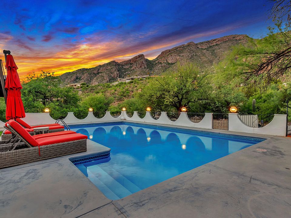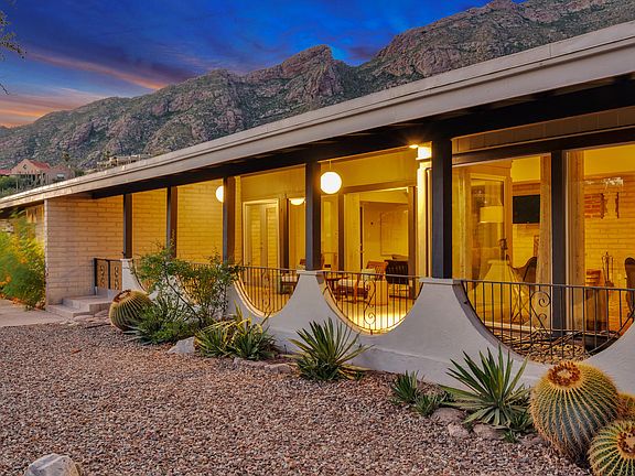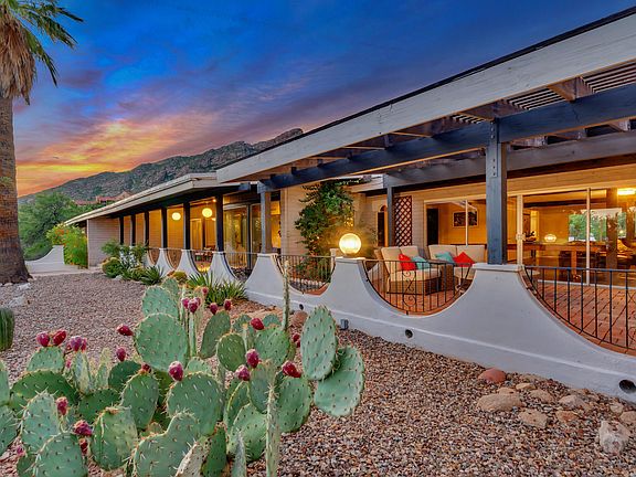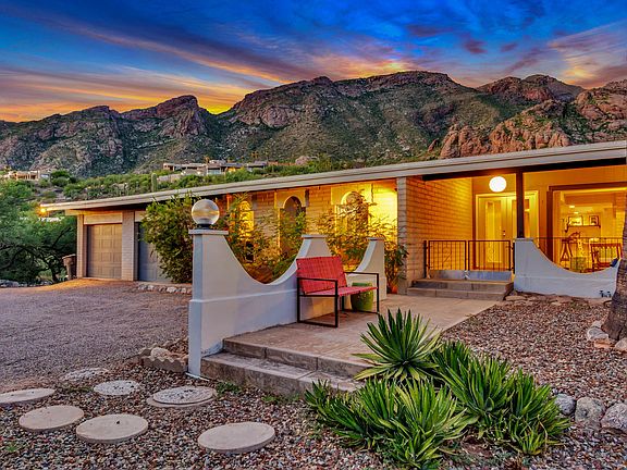 Completely updated mid century modern Santa Barbara style ranch on over an acre in gated Skyline CC Estates. Designer touches throughout. Kitchen includes stainless steel appliances, custom cabinets, quartz counter tops, fireplace, skylights ,breakfast bar and eat in area. Great room has 12 ft ceilings with floor to ceiling dual paned windows capturing sweeping views of the Catalinas. Every room has a view of either the Golf course or the mountains. Master bedroom suite w/luxurious bath & dressing area. Large family room is perfect for entertaining. Stained concrete floors are newly sealed and fresh paint throughout. Covered patio and sparkling pool. Room for a guest house on the East side of lot. Already has a private drive. 3 new HVAC systems installed in 2018.