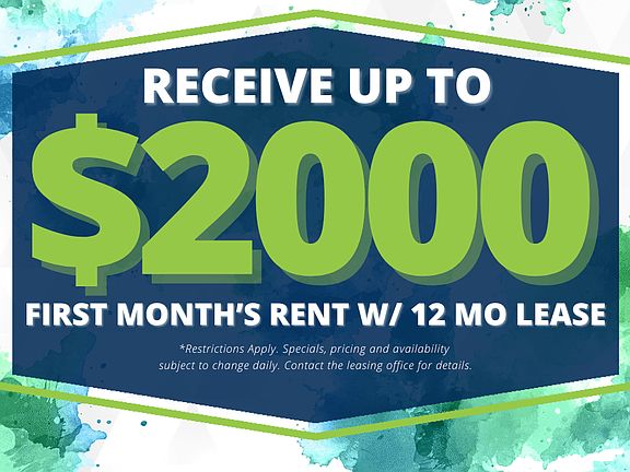 - Special offer! Up to $2000 off your first months rent with 12 month lease. Move in by October 31st. *Restrictions Apply. Specials, pricing and availability subject to change daily. Contact the leasing office for details.