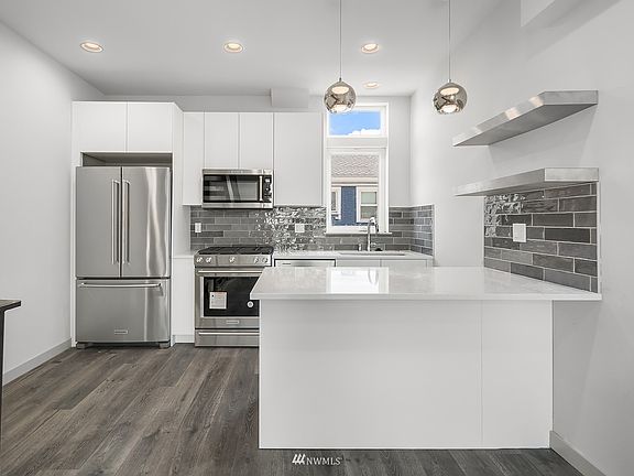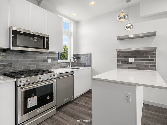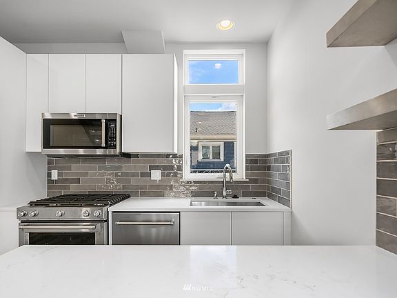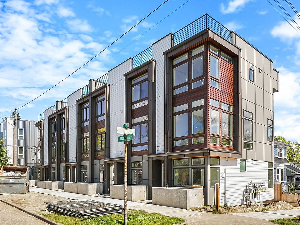 Only two luxury Wallingford townhomes left (on a quiet residential street), a collection of west-facing luxury homes with PRIVATE GARAGE, off street parking & no parking options! Close to Green Lake, Woodland Park Zoo, vibrant local shops, hip eateries, nightlife, breweries, sought-after parks, boutique fitness & more. Boasting a modern & eco-friendly design, this home offers an abundance of natural light, a gracious great room w/an open concept gourmet kitchen w/premium SS appliances, modern cabinetry & sleek quartz.A deluxe floating staircase leads to the top floor primary suite w/spa-like bath. 2nd bedroom on lower level w/bath.Entertainer's roof deck equipped w/gas, water&elect. DESIGNATED OFF STREET PARKING included!4-Star Built Green.