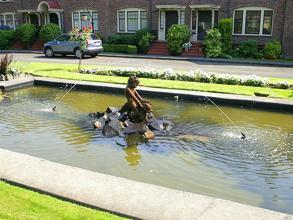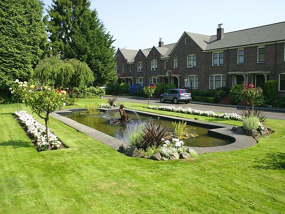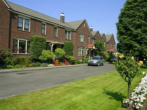 Hawthorne Square and incredible one of a kind 1920’s period architectural masterpiece! Be transported into another era with the central courtyard, circular drive, pond with fountain & statue and exterior masonry details. Charming original features include hardwood floors on main and upper levels, open staircase, wood burning fireplace framed by dramatic mantle, framed windows, original Italian tile in bathroom, large formal dining room, wide period crown molding, brass and glass door knobs and other classic touches. This townhome includes 3 bedrooms, 1.5 bathrooms, basement suitable for remodel, individual garage and additional dedicated parking space in front. Neighborhood Description Enjoy this wonderful walking neighborhood near Woodland Park Zoo, Phinney Ridge business district and downtown Seattle buslines.