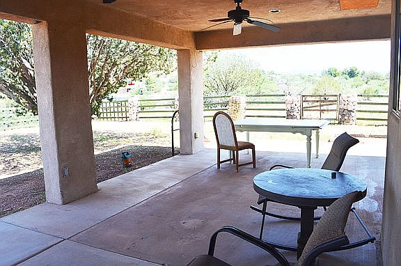 This is a real fine home, perched on a ridge-line the views are just fabulous. The fenced yards, front and back will keep dogs and children from wandering off. The large kitchen and covered patio make the house a prime location for casual country living. The master bath features double sinks and a large walk-in shower with two shower heads. While the new A/C unit and sliding patio door, along with the dual pane windows keeps the APS bill under control in the summer. The pellet stove keeps the house warm in the winter, keeping your propane in the tank. The acre is set on three levels, with the house and ample parking at the top.