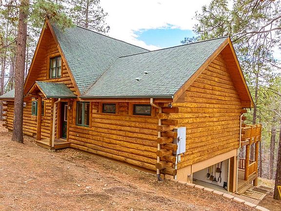 If you have ever dreamed of owning a classic log cabin in the woods, this lovely mountainside home is for you. You will love the panoramic views of the forest from the expansive decks. Enjoy cool summers at the 6900' elevation, and cozy winters by the fireplace. This is a true log cabin, with vaulted timber frame ceilings. Offers 2 levels with a walk-out basement featuring a large family room, a main floor which includes the master bedroom, and finally a large loft area upstairs. Lots of upgrades including stone fireplace, granite counters, wood flooring, skylights, and wood casement windows. True forest dwellers and dreamers won't want to miss it!