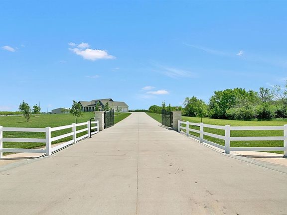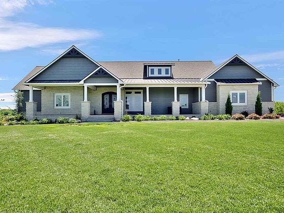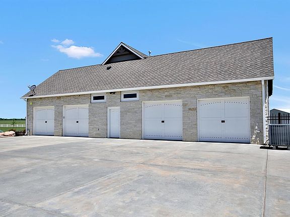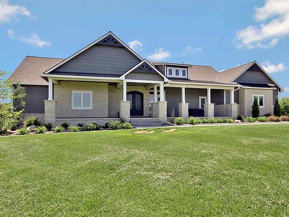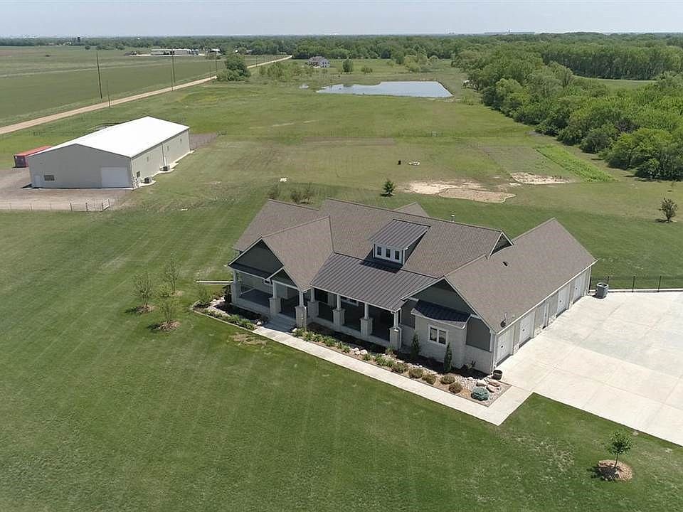 This home is the total package! The wife will fall in love with the home and the husband whether he is a car nut or wants the ultimate œman cave the search is OVER! This absolutely picturesque home built in 2013 is situated on approximately 9.5 acres in the Goddard school district. Over 6400 square feet, 8 bedrooms and 4 ½ baths. Granite throughout, beautiful craftsmanship style, crown molding, open floor plan, 10 ft. ceilings, abundance of windows for natural light overlooking the woods and pond. Huge kitchen and dining area with walk in pantry, commercial grade fridge, gas cooktop and the largest island you have ever seen! Built in buffet/hutch for convenience and real limestone gas fireplace. The master suite overlooks the back property and pond. Has many built-ins, 12 ft. ceilings, crown molding and master bath to die for! Luxury whirlpool soaker tub, huge tiled walk in shower, vanity, and double sinks. You also have your own full size washer and dryer in its own private room in the master bath. You can live in the master closet! The basement features polished concrete floors, 6 bedrooms and 2 ½ baths. Large wet bar with full size fridge, wine fridge and dishwasher for all of your entertaining! Custom designed weight room and floor. The basement also has its own laundry room. New interior and exterior paint. New custom light fixtures and blinds installed. Central vac throughout the house and garage. The attached 4+ car garage has custom shelving and cabinets. Enjoy your evenings watching TV on the covered deck. Custom Sun Bright outdoor TV mounted. New custom deck ceiling was added for a personal touch. Large stamped concrete patio below with professionally installed 5 person hot tub. This gorgeous property is entirely fenced, professionally landscaped with 77 trees in the immediate yard (Individual water ran to every tree!) 12 are fruit trees! 2 large garden areas planted with 20+ vegetables and fruits with individually installed watering heads. The property has a creek that runs through the property with lots of deer and wildlife! 60 x 125 steel framed, insulated metal building. SO much to say about this building. Here is just a few things. The building has 5 overhead doors all with openers, energy efficient florescent lighting, heat and air on one side, bathroom, exhaust fan and louvers in walls. The entire building has concrete floors. Custom installed electric winches. Security system and powered gate to access building from the main road. I cannot say enough about the quality of workmanship in this fabulous home. Schedule a showing today and let the property speak for itself. Additional docs online with more features of home. 37+ more acres available to purchase. See MLS#552584 for details.