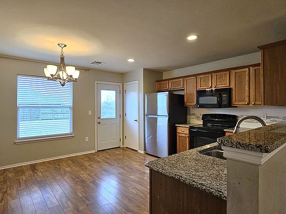 - Exterior features: Brick, Dual Vanity Sinks, Granite Kitchen Counters, Large Backyard, No Utilities included in rent, Range/Oven, Security: none, Storm Shelter, Walk In Closet, Wood Privacy Fencing