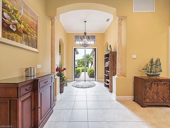 H.14761 PRICE IMPROVEMENT!!! Updated Saranac Model, built by Toll Brothers with view of #1 fairway and green in Naples Lakes Country Club an Arnold Palmer Signature Bundled Golf Course Community. Featuring 3 bedrooms plus den, 2.5 baths and a over-sized screened in lanai with a picture window. Gourmet kitchen that has been recently updated with granite countertops, the home has new hardwood floors in many of the rooms. Newer A/C unit, pool pump and heater. Solar hot water was all installed in 2017. Large Sunbrella Awning provides shade when needed on the lanai, full hurricane storm shutter protection. Private setting and NO Golf Cart Paths close by and yes you can own your own golf cart and NO CDD. Virtual Showing Video available.