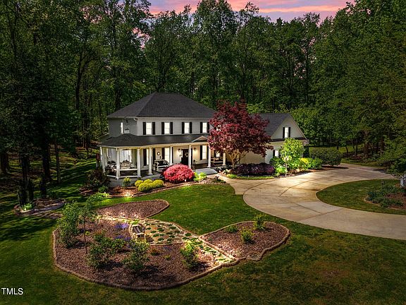 Introducing a Custom Built Charleston Beauty! Nestled on a sprawling 3.59-acre lot in prestigious Sunset Lake, this Southern estate offers an unmatched blend of elegance and natural beauty. Enjoy the serenity of a cul-de-sac located in the township of Holly Springs with a FV mailing address, no city taxes. Optional HOA membership available. Approach the home via a circular driveway, framed by lush landscaping and an enchanting English garden sitting area. Step onto the large rocking chair front porch or retreat to the captivating veranda, screened-in back porch, or sitting around the fire pit perfect for enjoying breathtaking sunset views.Spanning 5192 sq.ft, this home boasts a spacious floorplan designed to maximize wooded views, featuring 4 bedrooms (including 2 master suites, one on each floor) plus a 5th bedroom option, 4 full and 1 half bathroom. The expansive kitchen with walk-in pantry and oversized granite island flows seamlessly into the inviting dining area and family room, ideal for entertaining. Downstairs offers a gracious living area and private office, while upstairs showcases additional spacious bedrooms, a large bonus room, and an unfinished 3rd floor walk-up attic. Elegant finishes adorn every corner, including a luxurious primary suite on the first floor with a fully custom closet. With a 3-car garage and meticulous updates throughout, this home radiates pride and attention to detail. Experience the harmonious coexistence of luxury and nature in this extraordinary property, offering the finest in relaxing private living yet conveniently close to shopping and amenities. Your search for the perfect retreat ends here!