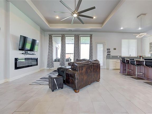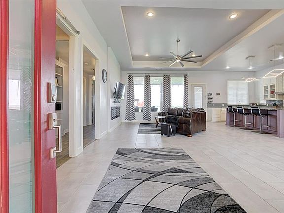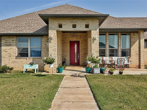FOUR bedroom contemporary home in Deer Creek schools! The open & bright floorplan welcomes you inside to the living room w/ modern electric fireplace, large windows & tray ceiling. The big kitchen features an island with prep sink, plenty of countertop & cabinet space, pantry, stainless steel appliances & open to the dining area. The master suite has private patio access, dual sinks, big tile shower & huge walk-in closet with access to the laundry room. Off the living room is a flex space that is the perfect area for an office, playroom or cozy 2nd living room that leads to the other bedrooms. All 3 beds are all nicely sized w/ great closet space too! Outside the huge covered patio looks out on the big fenced backyard. Other great features of this home are the large laundry w sink & hamper storage, tons of built-in storage throughout, walk-in tornado shelter, water softener & the whole home is ADA accessible. Conveniently located to I-35, UCO & Lake Arcadia. Schedule a showing today!