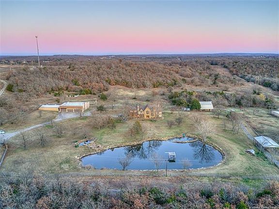 This property checks all the boxes!!! 129 +/- Acres tucked off of HWY 412 offering supreme privacy and seclusion. The amazing 4bd/3.5bath 4644 sf home was built by a master mason who used actual stones taken from the property which were precisely cut for the home construction, truly amazing. The gorgeous pond in front even has a fountain and diving board. Freshwater spring!! Two-story oversized shop, outdoor lighted arena, 6-stall barn w/ tack and hay storage. Views of Keystone Lake, 25 minutes to Tulsa.