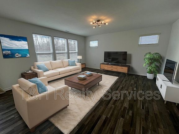 The Craftsman-style home features a covered front porch that leads into an open-concept living space, ideal for entertaining. A versatile main floor flex room can serve as a home office, formal living room, or playroom. The chef-inspired kitchen includes stainless steel appliances, a center island, a walk-in pantry, and ample cabinet space. The spacious back patio offers a great outdoor retreat. Upstairs, a loft connects to the laundry room and four bedrooms. The primary suite includes a bath with a dual sink vanity, tiled shower, linen closet, and walk-in closet. An attached two-car garage provides additional storage space. Virtual staging used. 2 year lease preferred. Note: In addition to the monthly rent, residents will pay $45 each month for a Resident Benefits Package.