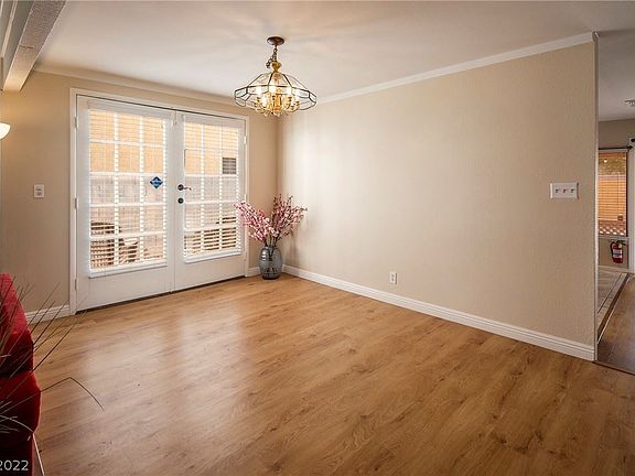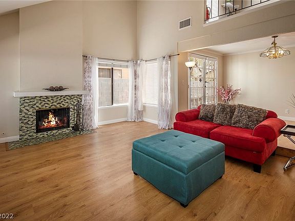 MOVE-IN READY 2,133 sq ft home featuring 4 bedrooms, 2.5 bathrooms, a loft, an attached 2-car garage, and a spacious backyard with a covered patio on a 5,663 sq ft cul-de-sac corner lot! This true find is centrally located, with only a short distance to the strip and in close proximity to many shopping & dining options and easy access to freeway US-95. This charming home welcomes you with a vaulted ceiling in the entry, leading to a living room with a fireplace. The kitchen is open and bright with lots of windows and adjacent to the family room which allows for convenient cooking and entertaining. The second floor offers a primary bedroom with a private bathroom, walk-in closet and a spacious balcony, 3 additional bedrooms, a full bath, and a loft. No carpet throughout the property! Outdoor activities abound for this property adjacent to the community trail, with access to the community amenities. Community has a RV/boat parking lot area. Call to schedule an appointment today!