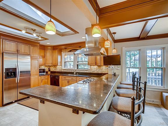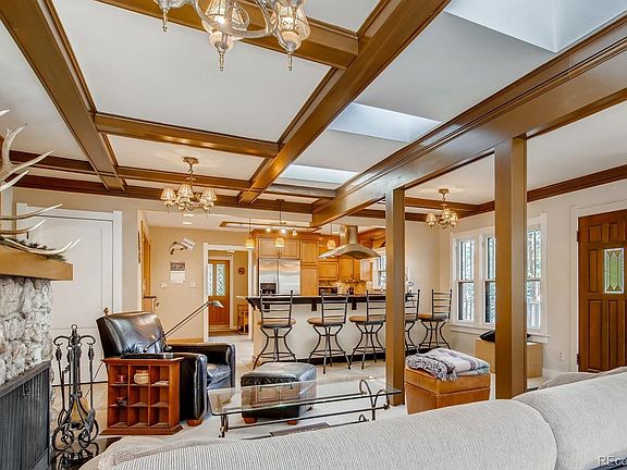 Nestled in the heart of Evergreen and a short walk to almost EVERYTHING: Evergreen lake, the golf course, downtown restaurants and shopping, Alderfer/Three Sisters Open Space Park, and award winning schools. This home is truly in a magical location! Drenched in natural daylight thanks to walls of windows complemented by seven skylights throughout, a beautifully updated kitchen opens to an elegant living room with coffered ceiling, pewter light fixtures, built-in cabinets, and a traditional stone surround fireplace. Take your party out onto the wraparound deck for lake views or enjoy the large private fenced yard. A 345 square foot studio at the back of the lot with wood burning fireplace, water, power, and gas is brimming with possibilities as an exterior office, art studio, ADU, or guest suite. With parking for up to five cars plus a 1 car garage, there's plenty of room for entertaining, and a large shed adjacent to the garage makes for a convenient place to store all of the toys you'll need in this wonderful place to call home. 21st century bonus: Comcast Broadband internet available here!