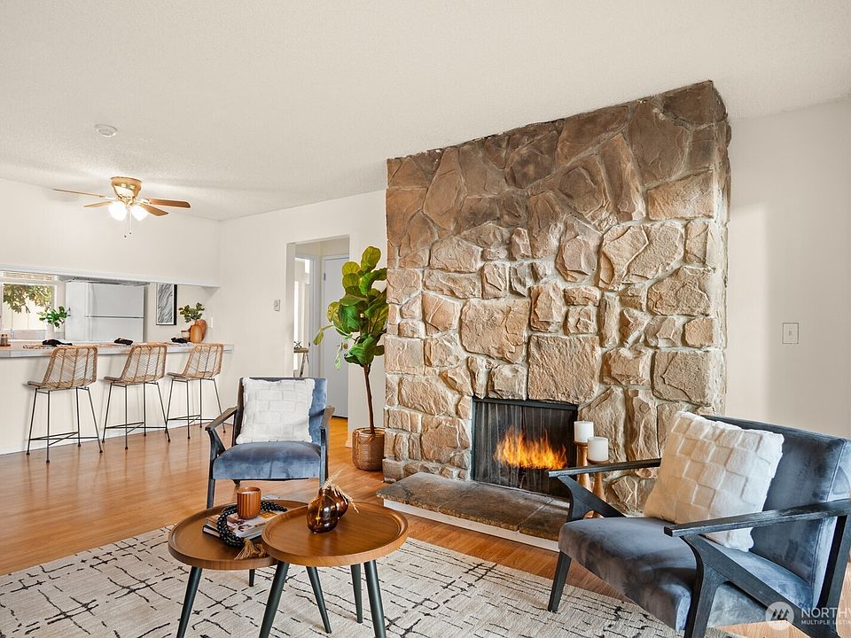 This charming ground-floor condo offers an ideal blend of comfort and character. You'll be immediately greeted by a bright kitchen with a convenient pass through, allowing for a view to the living area and lovely breakfast bar. Centered in the living space is a gorgeous floor-to-ceiling, wood burning stone fireplace, perfect as a statement piece and a cozy necessity in cooler months. Right off the main area you will find a full bathroom which is functionally located between both generous sized bedrooms. Throughout the space, large windows invite natural light while the ground level location offers easy access. If you're looking for a quiet residence that is also steps away from major grocery stores, don't miss your chance!