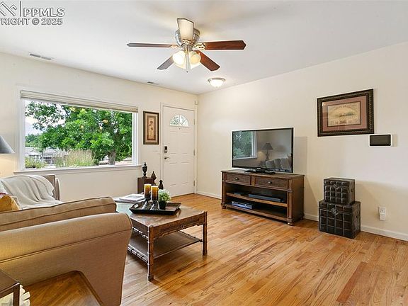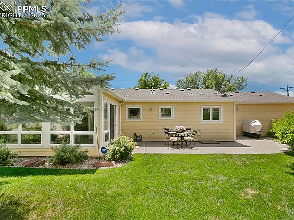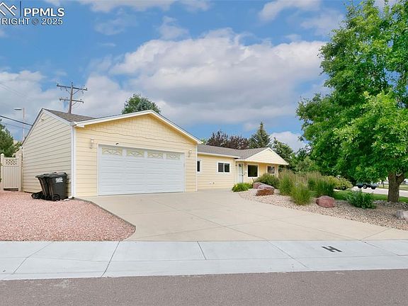 Rare opportunity to own a fully ADA-compliant, single-level home on an attractively landscaped corner lot with stunning Pikes Peak views. This thoughtfully designed 3-bedroom, 2-bathroom home offers 1,444 square feet of beautifully updated living space, an oversized 2-car garage with built-in workbench and storage, and additional parking for a boat, car, or RV. Enjoy an open-concept layout featuring gorgeous wood flooring throughout, a spacious living and dining area, and a well-appointed kitchen with granite countertops, crown molding, custom cabinets with pull-outs, under-cabinet lighting, and GE appliances—including a counter-depth refrigerator, built-in microwave, and electric range (gas line in place). The bonus sunroom includes heated tile floors, standalone HVAC, and year-round comfort. Both bathrooms feature heated tile floors, with the hallway bath offering a walk-in tub and separate shower. The private south bedroom includes an en suite bath. Home features include honeycomb top-down/bottom-up shades, LG washer and dryer with pedestals, lighted attic storage, and full ADA accessibility with wide doors and hallways. Recent upgrades include a newer roof, windows, electrical, plumbing, insulation, high-efficiency HVAC with humidifier, water heater, and fiber cement siding. The beautifully fenced backyard boasts a patio, water feature, shed, and mature trees. Located near UCCS, University Village, hiking trails, and I-25. Come see this one soon!
