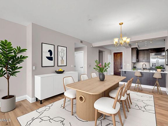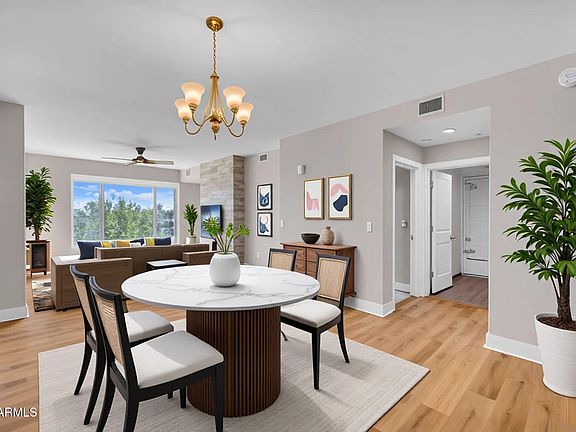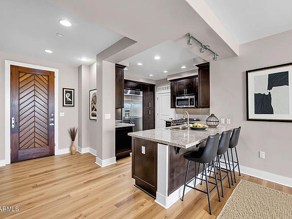 The Sage Condominiums in the heart of Downtown Scottsdale! This spacious 2-bedroom plus den residence combines elegant design with upscale comfort, perfect for seasonal or full-time living. Enjoy luxurious bathrooms with marble countertops, an open-concept kitchen with stainless steel appliances, light oak wood-style flooring, and a beautiful gas fireplace framed by floor-to-ceiling travertine tile. new carpet in the primary bedroom and new flooring in the living room, kitchen, and den. Enjoy resort-style amenities such as a sparkling heated pool, fitness center, clubhouse, wine storage room, and BBQ area; ideal for entertaining and relaxation.Located just steps from the Scottsdale Waterfront, Fashion Square Mall, world-class dining, art galleries, golf courses, and vibrant nightlife.