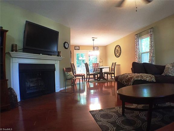 Nice, open one story home featuring 3 BR's and 2 full baths, and neighborhood with NO HOA! Great Room and Dining Room feature wood look laminate flooring, along with a fireplace in the great room. Tile floor in the kitchen with stainless steel appliances, and French doors from dining area leading to a private, wooded and fenced back yard with brick paver patio and storage building. Playset in back yard can remain.