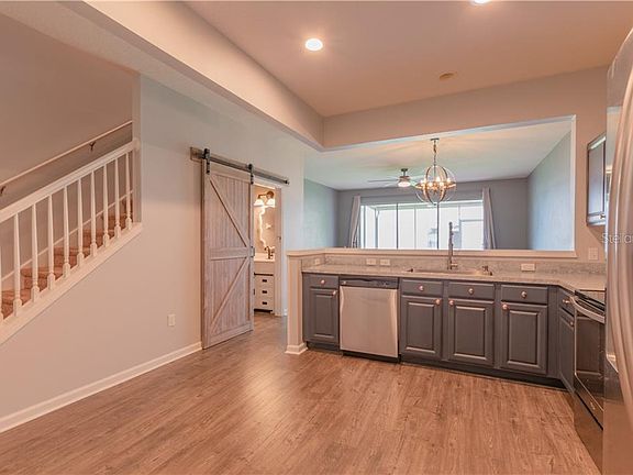 This gorgeously renovated 3 bedroom, 2.5 bathroom townhome in the gated community of Valhalla is conveniently located right off I-75. Whether commuting to Tampa, Wesley Chapel, Riverview, or Lakeland, this home is in in the perfect location. This open concept floor plan features a spacious kitchen that overlooks the living/dining area. Through sliding glass doors, the living room opens up to a covered and screened lanai that overlooks a pond. It's the perfect space for relaxing, entertaining, or dining al fresco. Throughout the downstairs is new gray laminate plank flooring. The kitchen includes stainless steel appliances, subway tile backsplash, plenty of cabinets, and a pantry. There is also a half bathroom downstairs. All three bathrooms have been upgraded. All three bedrooms are upstairs. The large owner's suite has a walk-in closet and en suite bathroom with garden tub and double sinks. The other two bedrooms share the full hall bathroom. The laundry closet is also located on the second floor, so no carrying laundry up and down the stairs, and the home comes with the washer and dryer. This home also have a spacious one-car garage. A/C was replaced in 2019. The HOA fees include: water, sewer, trash, cable, internet, irrigation, and two pools!
