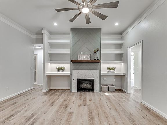 - Description: Bookcase,Built Ins,Ceiling Fan,Fireplace,Living Room,Remodeled,Vaulted Ceiling