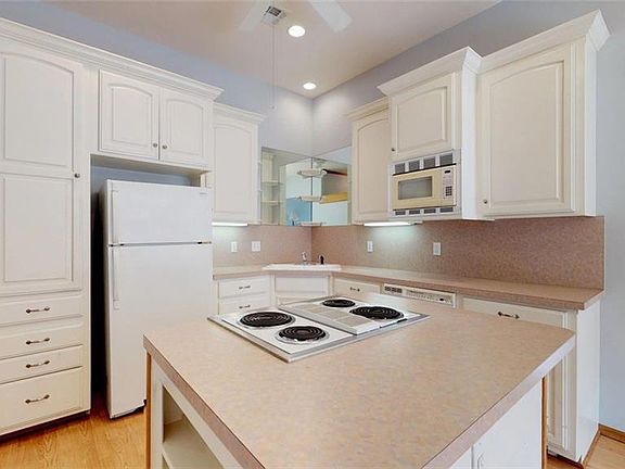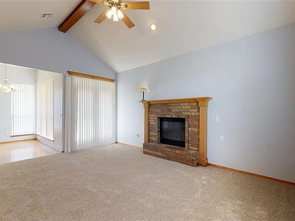 Beautiful nicely landscaped home with new paint and new carpet throughout. The living has a cathedral ceiling and a gas log fireplace. The kitchen has an island with shelving on two sides, a Jenn Aire cooktop, a corner sink, a built in microwave, and a pantry. There is a coat closet in the entry and a broom closet in the hallway. The laundry room has a sink, counter space, and cabinets. The master bedroom has a cathedral ceiling, a walk in closet, a jetted tub, a step in shower, and double vanities. The second bedroom has a walk in closet and a full bath. There is an L-shaped covered patio and a covered porch.