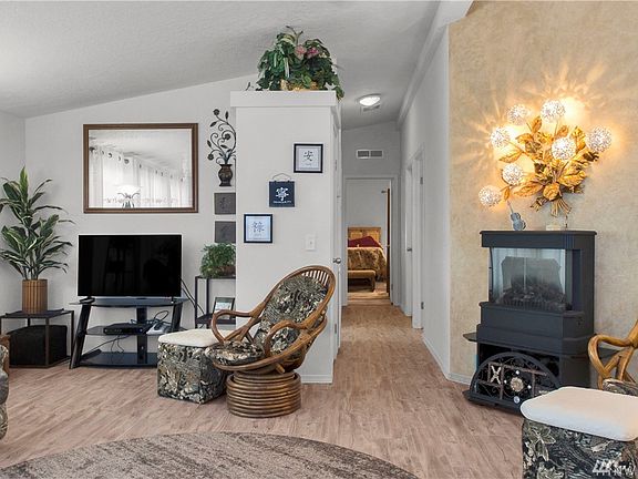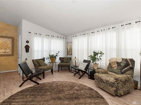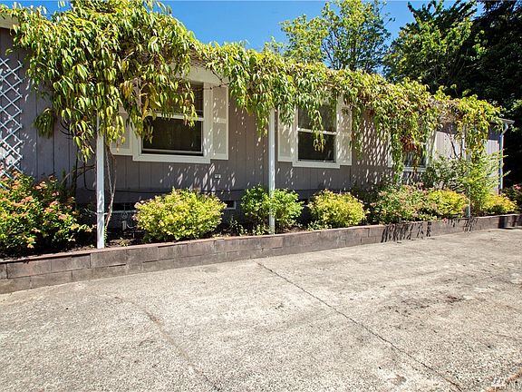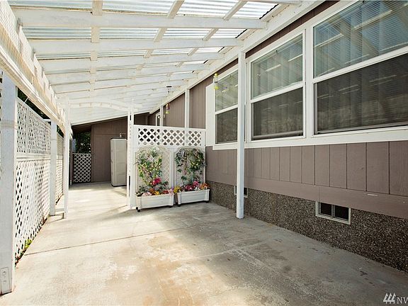 Another Beautiful home at Seashore Villa, a 55+ senior community. A 2005 Golden West home with an open concept, high ceilings and many windows bringing in lots of light. Built with maximum insulation and concrete aggregate skirting this home also has a sturdy wood storage shed, covered patio and carport AND a gigantic pergola with mature evergreen clematis. This home backs up to a green space and has a view of Budd Inlet.