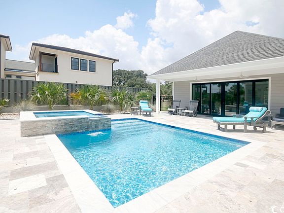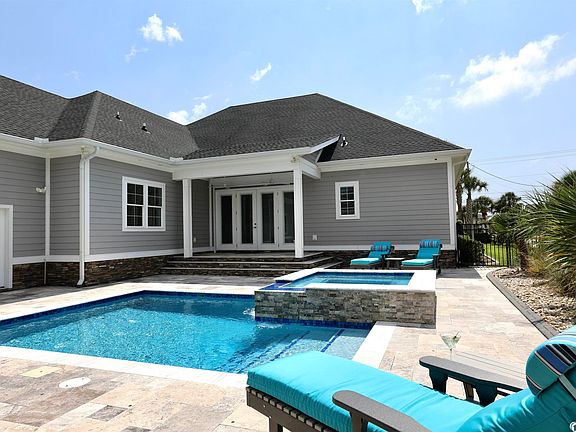 This luxurious second row home sits on a large lot extending from Ocean Blvd. to Burchap Drive in the prestigious Golden Mile area of Myrtle Beach. This single story home has 4 bedrooms with 4 en suite bathrooms. The vaulted great room and open design kitchen and dining room make entertaining a breeze. The home features granite countertops, custom cabinetry, 9 inch baseboards, and two-piece crown molding throughout. The large master suite includes sitting area, tray ceiling, his and her closets, deluxe walk-in shower, soaking tub, and a private porch. The property includes a heated pool and spa surrounded by a travertine pool deck. There is a luxurious pool house with full bath, quartz counters and bar, and kitchen, as well as an outdoor shower for beach days. Thoughtful touches include a whole-house generator, tankless water heaters, and 2X6 exterior construction with open-cell spray foam insulation to enhance energy efficiency. The attached 4 car garage includes a designated power outlet for rapid EV charging and a built in shop area/work bench. The home is highlighted by beautiful landscaping, with exterior accent lighting, and external cameras and security system. Hardwired access points are installed in the home, garage, and pool house to ensure seamless WiFi throughout the property. This home offers easy access to the beach and golfing along with all of the other activities the Grand Strand offers. Check out our state of the art 3-D Virtual Tour.