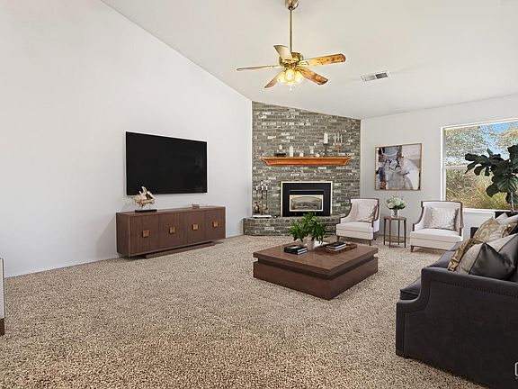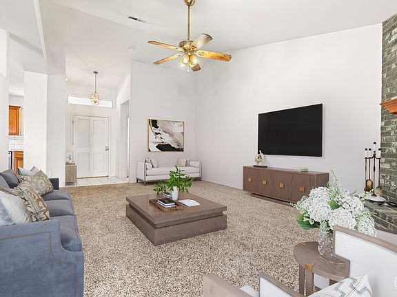 You should be dancing your way to this deal in Hurlingham Estates! Great room plan with 3 bed, 2 bath, RV parking, and Solar. Oversized living area with vaulted ceiling and beautiful corner brick fireplace compliments the adjacent dining area with large sliding glass doors and backyard view. The open concept kitchen has a corner sink with large windows, loads of cabinetry, and easy access to the garage. Split wing layout with built in cabinetry and a designated laundry room with sink. Large owners suite with walk in closet and awesome oversized shower is sure to comfortably fit a king size bed with additional furniture. Covered patio with gas stub out has plenty of room for your next barbeque or get together. RV parking includes extra concrete in the driveway and metal gates. Don't forget the solar panels and updated AC that really help keep those energy bills low. Schedule your showing today before this deal is gone!