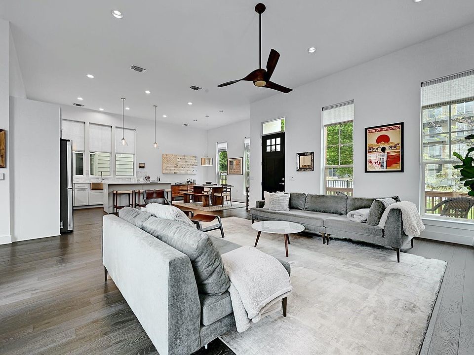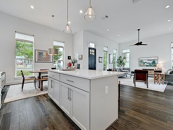 Beautiful stand-alone modern Farmhouse with high ceilings and bright, open floor plan. Gourmet kitchen with quartz counter tops, center island and modern cabinetry. Upstairs bedrooms include the owner suite, featuring a luxuriously over-sized bathroom, centered by its large soaking tub, double vanities and a glass-enclosed XL shower, as well as an equally generous walk-in closet. Fenced front yard and back patio. Great location - only a few minutes from Mueller HEB, 15 minutes to Downtown Austin, or 15 minutes from Bergstrom Airport. Fridge, washer, dryer included.