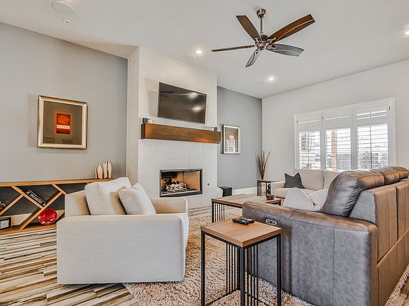 Welcome to Oakmont Estates! This beautifully designed home is on a corner lot, blends modern style with everyday comfort. At the heart of the open floor plan is a gourmet kitchen with Thermador appliances, an oversized island and abundant cabinet space—perfect for both daily living and entertaining. Wood-look TILE floors, plantation shutters, and a cozy gas fireplace bring warmth and character throughout the living areas. The primary suite is a true retreat, featuring double vanities, view of the pool out of your window, a soaking tub, walk-in shower, and a massive closet. With four bedrooms in total, the flexible fourth room works perfectly as a home office, nursery, fitness space, or guest room. Step outside to a backyard built for year-round enjoyment. A covered patio with fireplace, fire pit, and sparkling pool with tanning ledge, hot tub, fountains, and pebble finish—all controlled by app—create the ultimate mix of relaxation and entertaining. Additional upgrades include a new roof, whole-home sound system, REME HALO air purifier/humidifier, ensuring comfort and peace of mind. Every detail has been thoughtfully designed to give you style, function, and that "just right" feel.