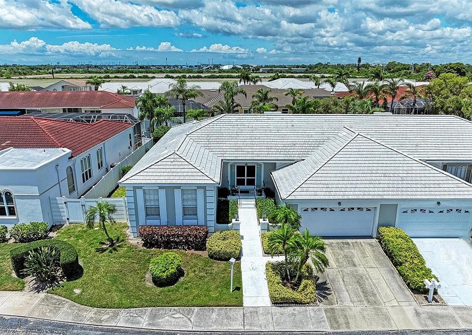 A must-see! This gorgeous custom-designed villa with exquisite taste and a rare excellence in design in the maintenance-free community of Palm Court. This spacious, move-in-ready, 2,098-square-foot, three-bedroom, two-bath, two-car garage villa has many reasons to look no further for the perfect home. As you walk through the front door enjoy the craftsmanship of luxury living, with bright natural light, porcelain tile flooring throughout, high vaulted ceilings, a spacious open living area, ceiling fans, wood-burning fireplace, recessed LED lighting with dimming lights and living room sliding glass doors leading to the large screened lanai area. This home is in immaculate condition with an updated ivory kitchen with granite countertops, stainless steel appliances, state-of-art induction cooktop, air fryer oven, soft close cabinetry, pull-out drawers and a breakfast bar. Step into the large primary bedroom with high ceilings, two walk-in closets, a beautiful en-suite bath, a walk-in shower, a luxury jet tub, stone countertops and dual sinks. The second bedroom offers privacy and a window view of the community pool, which is just across the street from the home. The third bedroom is perfect for your visitors or for an office. The guest bath is conveniently located between the second and third bedrooms and offers stone countertops and a tub. You will also find a separate laundry closet just off the kitchen with a washer, dryer and shelving for extra storage. The spacious lanai offers 700 square feet of extra living space for relaxation, exercising and entertainment. Huge Storage space in the garage. Step outside and you will find an oasis of beautiful landscaping, plus a garden area to plant your favorite vegetables or flowers. Pet-friendly community with no age restrictions. Palm Court has a community pool with a clubhouse, which is located just a few steps from the front door. The condominium fees include tile roof, exterior maintenance, sewer, trash, internet and cable. Must own for two years before allowing to lease property. Just a short distance to the beautiful beaches of Anna Maria Island, shopping and tasty restaurants. Constant breezes from Sarasota Bay only a few hundred yards away, beautiful villa home in unique small community, high and dry, with huge community pool right outside the front door at a cheaper cost than maintaining a home pool, walking distance to the IMG golf course and the Bradenton Tennis Club, 3 miles to the Post Office. 3.5 miles to IMG Academy, Cortez Village 10 minutes away, 15 minutes to the Ringling Museum and 20 minutes to SRQ Airport. Make your appointment today to see this amazing home! Click on the 3D virtual tour link to virtually walk through the house.