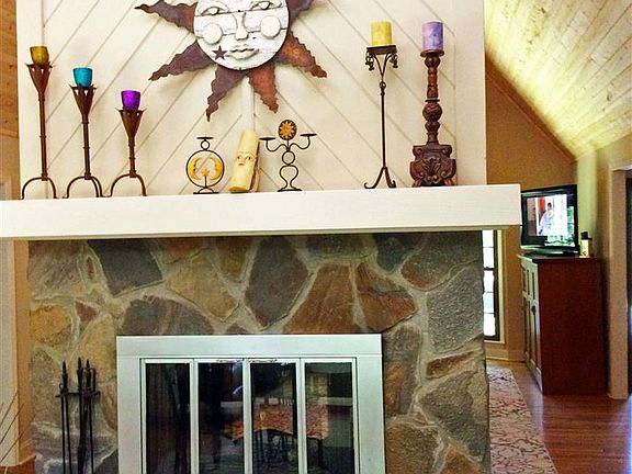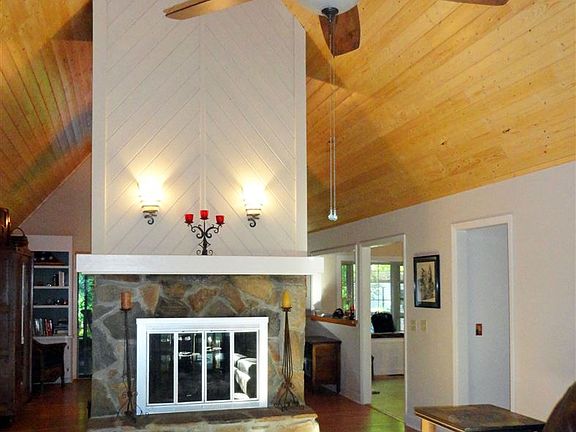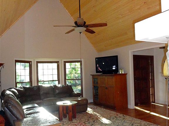 This beautifully maintained spacious home sits on three lots. A very private setting of over 2 acres. The flagstone driveway and walkways are beautifully done. Hardwood floors open to the living room with a stone bi-view fireplace between the living room and dining room reaching to the peak of the wood covered cathedral ceiling with exposed beam. The dining room has built-in book cases and cabinets and a three section patio door opening to the sunroom. The sunroom has California cedar walls and ceiling and is heated by gas. A perfect year round living space with nature all around. Patio doors on the 3 exterior walls can be opened for a screened porch effect. The kitchen has been remodeled to include cabinetry with pull out shelves, solid surface counter tops, a granite topped island, stainless steel appliances, and a bay window overlooking the deck. All windows have been replaced with vinyl tilt. The split bedroom design has a master suite with crown molding, plantation shutters, a walk-in closet, and master bath with a vanity and glass enclosed shower stall. Bedrooms 2 & 3 share a hall bath with a tub/shower. One has a walk-in closet and both measure 14' x 12.5'. The property has very nice landscaping on the main lot around the house and wooded areas on three sides for privacy. There is also a deck and storage building/shop.