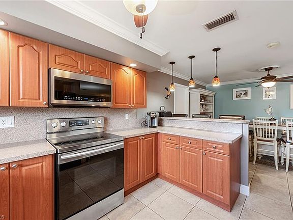 Welcome to this beautiful, well-maintained 3-bedroom/2-bath home on a corner lot in the Lely Villas neighborhood in Lely Tropical Estates. This is a deeded community where homes have zero lot line, which means you do not own the property; you own the house & land that sits directly under the house. Lawn & land maintenance, water, irrigation water & basic cable are all included in the low $269 monthly fee. As you enter the home, you're treated to a spacious, great room floor plan, lighted built-in shelving with cabinet storage, crown molding & tile floors throughout for easy maintenance. Great room is wired for surround sound. Kitchen boasts ample counter space & cabinets, all new stainless steel appliances (except refrigerator) & breakfast bar, plus a separate dining area, perfect for entertaining family & friends. The master bedroom is flooded with natural light, has a walk-in closet & an en-suite with tiled shower. 2 additional bedrooms & full bath for guests' privacy. Interior storage room off the 2-car garage. Garage has a fridge/freezer & laundry. Sip your morning coffee or evening cocktail on the patio, surrounded by shade trees & enjoy this peaceful, pet-friendly community.