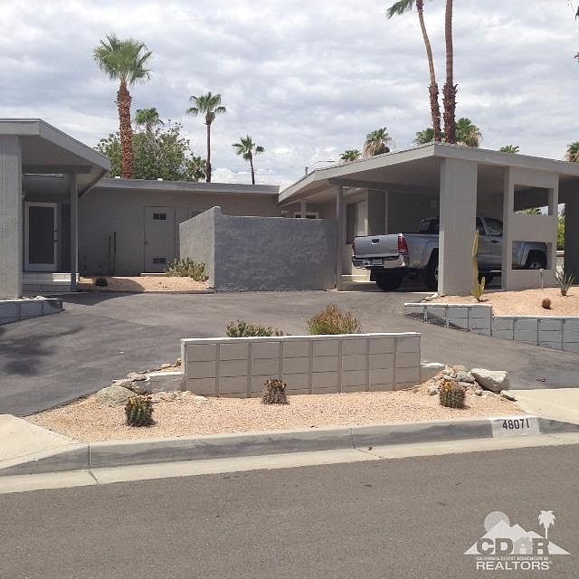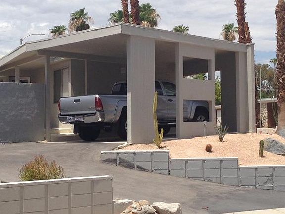 Like a DUPLEX but not! A rare opportunity to purchase two ATTACHED small homes. Live in one & rent the other out! (Seller will not consider selling units seperately) Each unit is 945 SF. Both have one bedroom, a nice sized kitchen and TWO full bathrooms. Both have a large covered patio, new roof, new water pipes, new electrical wiring, new A/C units, and new flooring. This unit is the one on the corner. Back yard is fully enclosed and is private. Home has been renovated with glassed entry door, terrazzo flooring and French doors in living room. The glass block wall on north side of living room allows the room to be filled with comfortable light. The Kitchen and both bathrooms have been redone. Both homes have single-car carport and share a curved driveway. These two units have prime South Palm Desert real estate LOCATION. They are very close to The Living Desert. Buyer must qualify to purchase both units together (Price of $530,000 is for both units)