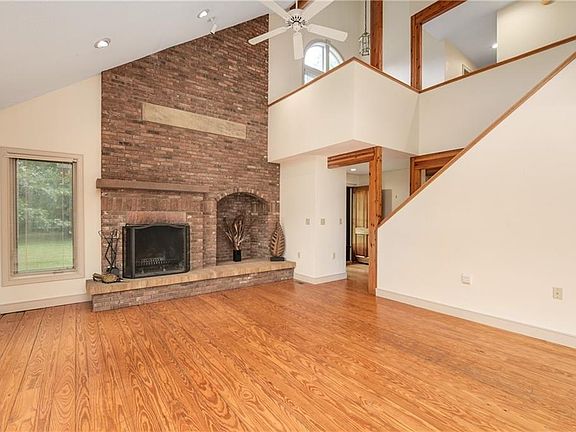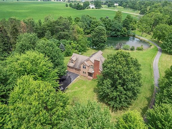 Nestled on 11.6 acres and sitting privately amongst the trees...you will wind down the drive past the pond that houses plenty of mother nature. This custom built 4/5 bedroom / 3 full bath home has its own uniqueness and quality to boast. As you enter the home the Great room with wood floors and floor to ceiling fireplace makes a statement. Adjoining is the sunroom area that brings the outdoors in and the warmth of the sun. The kitchen with custom Italian Berloni cabinets and Cambria countertops, they speak for themselves, from the soft close to the most stunning appeal. There is a two-tier island, pendant lights, double ovens and New Refrigerator. Plenty of drawers and a great layout for entertaining with the open floor plan. A screened in porch off the kitchen offers the best views and memories can be made overlooking the moonlit nights and the pond. As we continue on the 1st floor there is a full bath and an office or the 5th bedroom if needed. On the 2nd floor you will find the owners suite with vaulted ceilings, spacious private bath, 2 closets and a private deck overlooking the pond and scenery. There are 3 additional bedrooms and one has a unique in-room loft, a full bath, and a sitting area that overlooks the great room. The laundry area is conveniently located on the 2nd floor as well. Full walk out bsmt with herringbone laid brick floors. Huge 40 x 80 Outbuilding with (2) 12' H x 14' W doors and (2) 13' H x 15' W doors, 14' ceilings, concrete floor, water and electric.