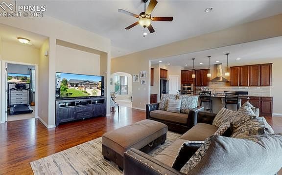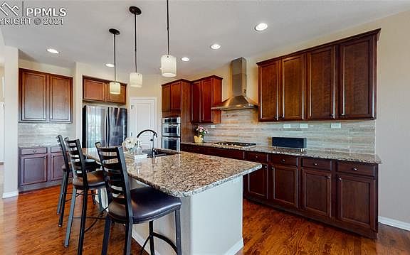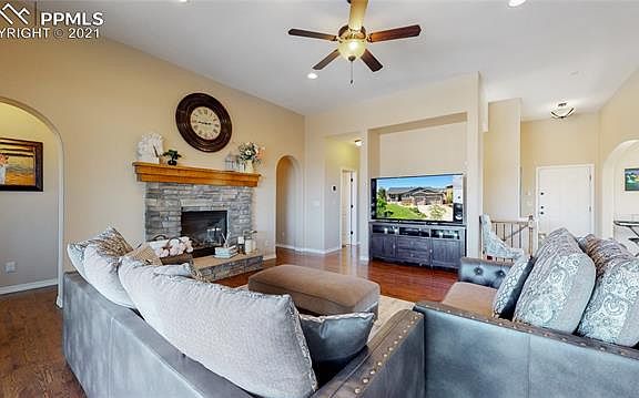 Why wait to build when you can move right in to this model perfect D-20 rancher offering main level living at its best?! Enjoy the open floor plan with the great room, kitchen & breakfast nook flowing seamlessly together with extensive glowing, upgraded solid oak floors. Enjoy Peak views from the front porch or formal dining room. The gourmet kitchen features cherry cabinetry, granite counters with full height tile back-splash, gas cooktop, built-in double ovens & spacious island & nook. The great room hosts a stacked stone gas fireplace & walks out to a covered patio. The main suite is tucked away & has a private spa-like bath with two vanities, luxurious bathtub, walk-in shower, 2 walk-in closets and upgraded oak flooring. The main level also features a secondary bedroom with adjacent full bath & laundry room with sink. The open floor plan in the lower level allows for all of your favorite games while enjoying a cold beverage in the spacious wet bar. It also provides you with 2 generously sized bedrooms, a nicely appointed hallway bathroom, another stacked stone fireplace & large storage area. The home is pre-wired for additional security & for an entertainment system on the lower level. The 28.9 foot long 3 car garage will accommodate oversized pick-trucks! The gorgeous community center with swimming pool, exercise room & club house is included as part of neighborhood living. 2 blocks to the elementary school; walking distance to the new middle school; tons of recreation with parks, shopping, restaurants. Good access to military bases & hospitals along with with easy access to I-25 & Hwy 83 which allows for a quick commute to Denver.