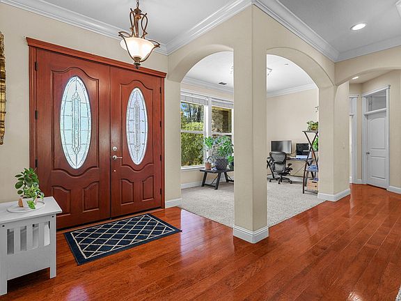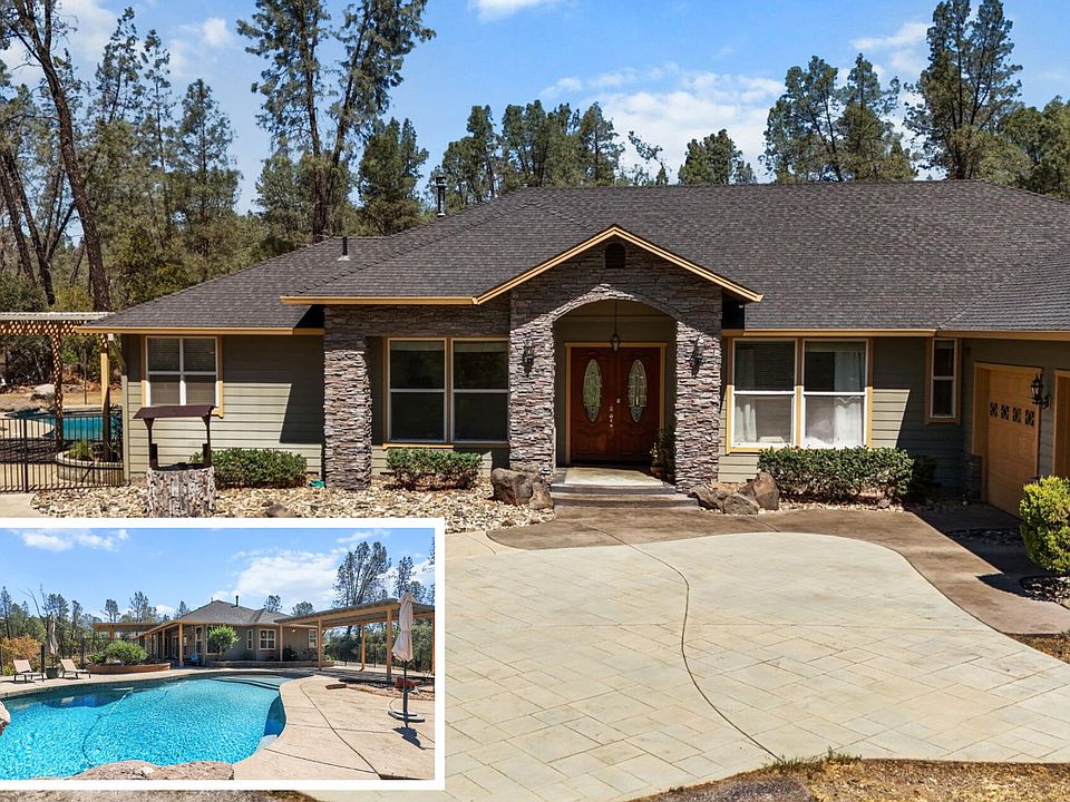 Welcome to this spacious 4-bedroom, 3-bathroom home offering 2,992 sq ft of well-designed living space, situated on 2.5 serene acres. Enjoy an open-concept floor plan with ten-foot high ceilings, elegant finishes, and room to breathe. In addition to the four generous bedrooms, there's a dedicated office and a formal dining room that can easily serve as a flex space to suit your needs. The stunning kitchen features abundant cabinetry, expansive granite countertops, and is ideal for both everyday living and entertaining. Cozy up to one of the two fireplaces—one in the living room and the other in the primary suite. Step outside to enjoy multiple outdoor living areas, including a concrete back patio, two covered patio spaces, and a PebbleTec pool—perfect for relaxing or hosting guests. A beautiful seasonal creek runs through the back of the property, adding to the tranquil setting. Additional features include a paved driveway, an attached 2-car garage, plus a detached shop that can double as a second garage. The home is served by REU electricity and boasts high-speed Spectrum internet—uniquely wired as one of the only homes in the area with this service. Tucked away on a private gated road with no HOA fees or restrictions, this home offers the peaceful lifestyle you've been looking for.