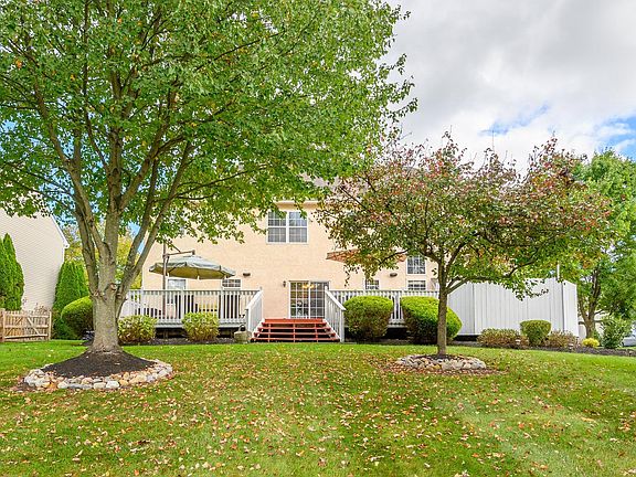 Welcome to this well appointed 4 bedroom, 2.5 bathroom home that is perfectly situated on a beautifully landscaped lot in the highly sought-after Hearthstone neighborhood in Buckingham, on serene cul-de-sac street. As you step inside, you'll be greeted by hardwood floors that lead you to the heart of the home—a grand, sunlit two-story family room featuring a striking wall of windows surrounding a cozy gas fireplace. The updated kitchen is a chef's delight, complete with granite countertops, a spacious kitchen island, and modern stainless steel appliances. Enjoy casual meals in the charming breakfast area, which opens through sliding glass doors to an expansive oversized deck, complete with a dedicated space for a sunken hot tub—perfect for relaxation and entertaining. The first floor also boasts a sophisticated office/den, ideal for remote work or quiet study, as well as a convenient powder room and a generously sized laundry room with a utility sink and direct access to the two-car garage. Venture upstairs to find the inviting primary bedroom, featuring two walk-in closets and an en-suite bathroom that offers a soaking tub, glass-enclosed shower, and double vanity sink—your private retreat. Three additional bedrooms share a nicely appointed hall bathroom, while both the main and secondary bedrooms benefit from stylishly designed closet organizers, maximizing storage with flair. Need more room? The unfinished basement is a blank canvas, ready for your personal touch to create the perfect additional living space. Experience the warmth and character of this thoughtfully designed home, complemented by Central Bucks’ award-winning schools, convenient shopping and dining in nearby Doylestown, and easy access to major commuter routes to Philadelphia, New Jersey, and NYC.