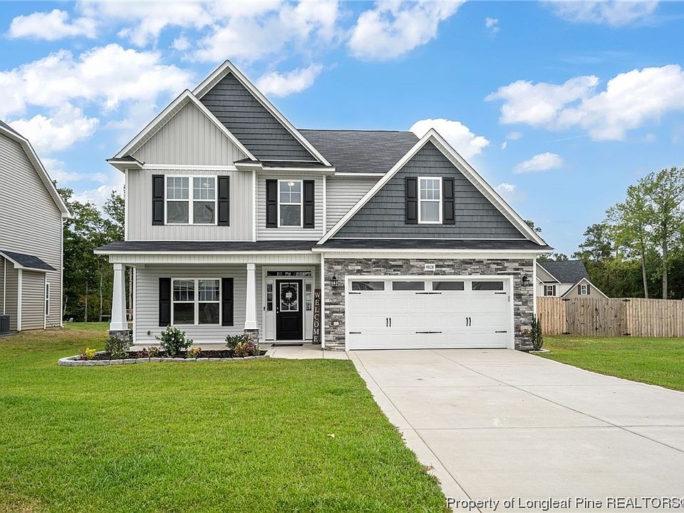 FABULOUS 4 bed, 2.5 bath home in Grays Creek Villas built in 2021. Open floor plan downstairs with vinyl plank flooring throughout -includes formal dining w/ coffered ceiling, spacious family room w/ gas fireplace, beautiful kitchen w/ SS appliances, granite countertops, pantry and breakfast area. Half bath w/ pedestal sink, nice catch-all/mudroom w/ closet off garage. Upstairs includes full bath, laundry room, 3 beds all nice size and double closets, carpeted, plus the large Primary bed w/ ensuite bath featuring double vanity, soaking tub and large shower w/ seat, walk-in closet. Great back yard w/ patio and added fence w/ double gate. Great location near 87 and I-95!! Not far from shopping, dining, and the Fayetteville Regional Airport. Don't hesitate - schedule your showing and come see this beauty today!
