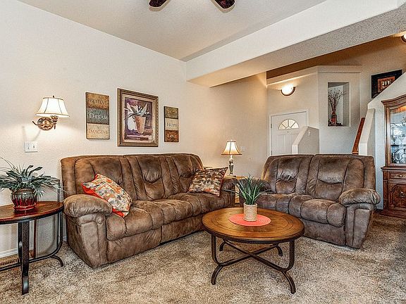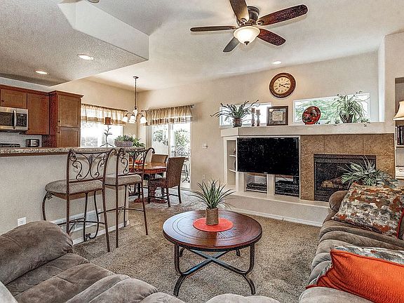 Two-story three bedroom Townhome with finished basement in gated, safe, well-maintained community. Two living areas. The main level includes the open combination of living room, dining room and kitchen, perfect for entertaining, plus half bath. Features include fireplace, stainless steel appliances, walkout to deck with Pikes Peak mountain view. The upper level offers three bedrooms, two baths and laundry area in the common area. The master suite with Pikes Peak/city views, has adjoining bath with double vanity and walk-in closet. The finished garden level basement provides a spacious family room, closet and unfinished storage room/furnace area with storage shelves. Two-car garage with overhead storage. Central A/C. 4 ceiling fans. Close to parks, trails, schools, shopping and coffee shop. . HOA includes lawn care, snow removal, exterior maintenance, trash removal and insurance.