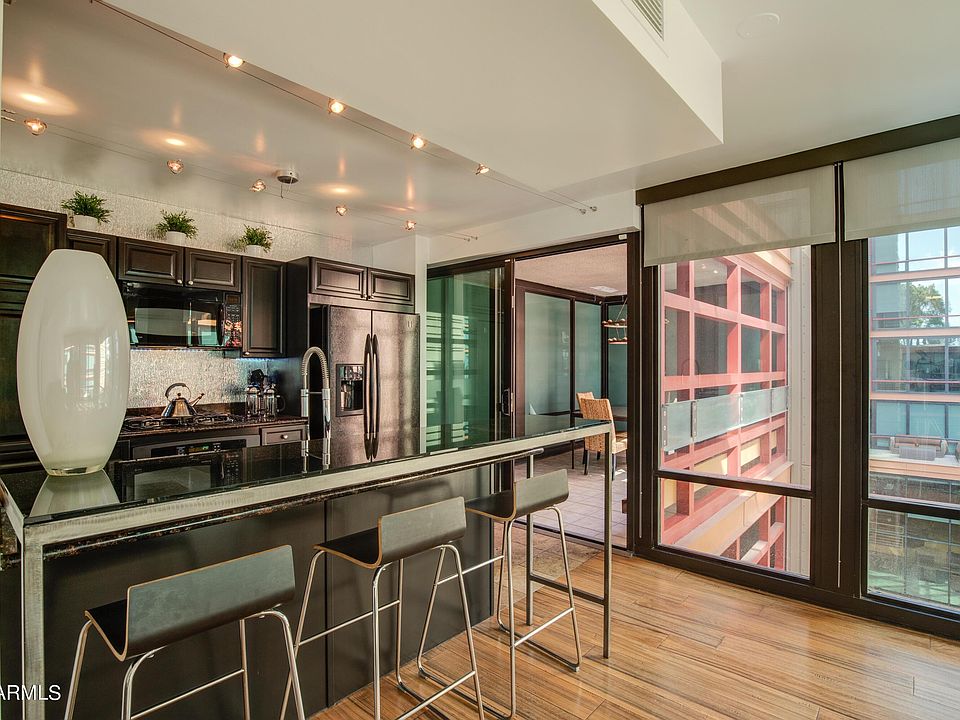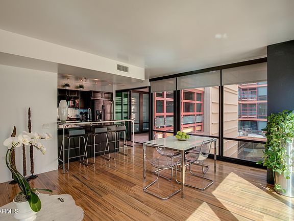 Unique Floor Plan,1 Bedroom, 1 Bathroom Condo Featuring approx.10' high Corner Glass Walls in Living/Dining Area. Interior Courtyard Views to fountain and parklike, sheltered landscape. 5th Floor loc. w/ only one common shared neighbor wall. Exotic African Walnut Floors, Black Alligator Wallpaper in Bedroom, White Ostrich Wallpaper in the Bathroom. Kitchen features Custom Black Glass/Steel Bar Top and Granite Countertops. Large covered Patio for Dining and relaxing. Building is located in the very desirable Camelback Corridor close to shopping, dining, nightlife, freeway access and airport. Amenities include fitness center and outstanding roof top garden, BBQ area, pool and spa. Secure underground parking and storage unit which convey with prop.