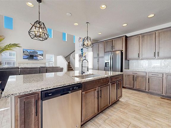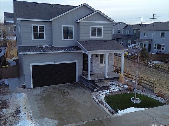 Don’t miss 4808 Point Mesa Street. A 4-bedroom, 3-bathroom home in the highly sought-after Terrain community of Castle Rock. This home is perfectly positioned with no neighbor directly connected on the southwest side, allowing for added privacy and tranquility. The office is perfectly located to the right of the entryway, making it a quiet ideal workspace for remote professionals or just a quiet study area. The living room fireplace features custom stonework, and is complemented by a natural wood mantel. Upgraded tall doors, and lighting fixtures throughout which elevates the homes modern aesthetic. The gourmet kitchen features ample kitchen storage, sleek cabinetry, and herringbone-patterned tile backsplash. A large center island provides additional prep space and seating, perfect for casual dining or entertaining guests. The primary bedroom and ensuite bathroom features dual sinks, a walk-in shower, and a generous walk-in closet. The additional bedrooms each offer unique custom touches. The second bedroom features charming wainscoting on the walls. The third bedroom is designed with built-in storage/counter space, and mountain views. Gorgeous wallpaper throughout the home which adds a designer touch. You enter into a mudroom from the attached garage, with built-in bench and cubbies, and an extra coat closet. The unfinished basement offers an additional 1,180 sq. ft., ready for your personal touch. Maybe a home theater, gym, additional bedrooms, or a recreation area, this space provides endless possibilities for customization. Outside the extended patio with pergola creates a frame for a shaded retreat for outdoor dining and relaxation. Beautiful professional landscaping. Trampoline included. 220V in garage and back patio, Garage has EV outlets. Additionally, Terrain residents enjoy fantastic community amenities, including, club house, 2 pools, 3 parks, tennis courts and scenic walking/biking trails. Located within bus route to Sage Canyon Elementary,