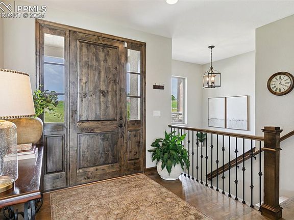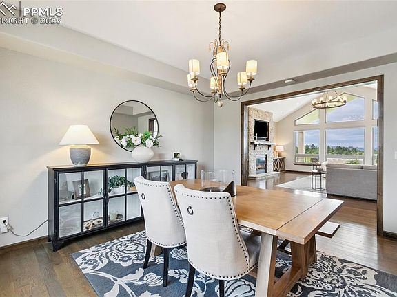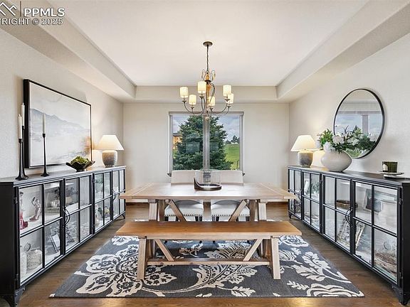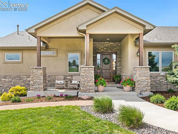 Welcome to Your Stunning Ranch-Style Retreat in Black Forest! Nestled on 2.51 acres of picturesque open meadows, this impeccably maintained custom home offers the perfect blend of privacy, luxury, and convenience—right on the edge of the beautiful Black Forest. Step inside to rich hardwood floors that lead into the soaring great room, where a floor-to-ceiling stone fireplace and vaulted ceilings create a warm, inviting atmosphere. The open layout flows seamlessly into the elegant formal dining room and a gourmet kitchen, featuring an oversized granite slab island, espresso cabinetry, high-end appliances, and a casual dining area, perfect for any home chef. Step out onto the covered Trex deck to enjoy al fresco dining and peaceful views of your tranquil surroundings. The luxurious Master Bedroom is a true owner’s retreat, offering breathtaking views and a spa-like five-piece bath complete with a soaking tub, custom-tiled zero-barrier shower, dual vanities, and a spacious walk-in closet. A see-through fireplace adds warmth and ambiance between the bathroom and adjoining bedroom. A second main-level bedroom provides flexible space for guests or a home office, complemented by a large laundry room and a functional mudroom. The finished walk-out basement is an entertainer’s dream, featuring a spacious family room, custom wet bar, home theater, and three additional large bedrooms, one with a 12' x 7' walk-in closet, plus a full bathroom and two generous storage rooms. Additional Features Include:3-car garage with two EV charging stations; Central air; Central vacuum system; Custom window treatments and blinds; elegant finishes and thoughtful upgrades throughout. Enjoy the serenity and natural beauty of Black Forest while being just minutes from Hwy 83 and the amenities of city living. This one-of-a-kind property is the perfect sanctuary for those who value comfort, style, and exceptional craftsmanship. Schedule your private showing today - your dream home awaits!
