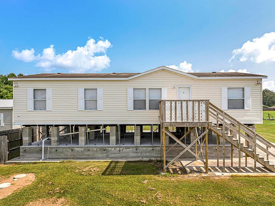 Discover the inviting charm of this cozy mobile home nestled on a tranquil half-acre lot in St. Amant. With 4 bedrooms and 3 bathrooms, there's plenty of space for you and your crew to spread out and relax. As you step inside, you're greeted by a warm living room boasting rustic beamed ceilings and abundant natural light. The adjacent kitchen is perfect for whipping up delicious meals, offering a spacious island, ample cabinets, and patio doors opening onto a delightful 10 x 10 deck – ideal for enjoying the outdoors. Retreat to the master bedroom, featuring a spacious walk-in closet and a luxurious en-suite bathroom with a soaking tub and separate shower. The convenient laundry room provides extra storage and room for a freezer, making chores a breeze. Outside, a substantial concrete slab awaits your creative touch. Whether you dream of a covered patio, extra storage space, or a cozy outdoor hangout spot, this versatile area is yours to customize and enjoy.