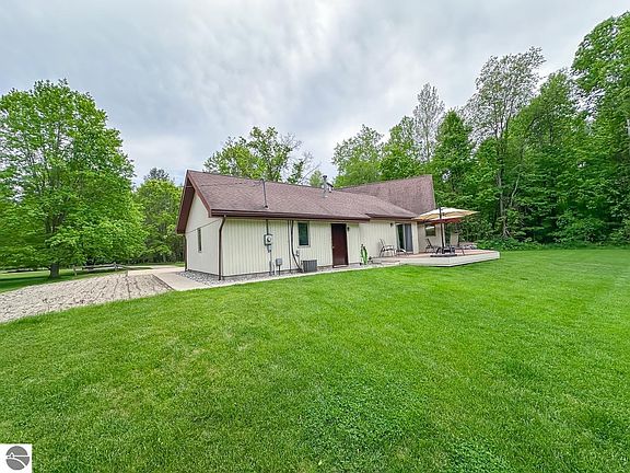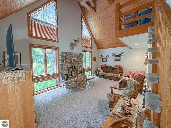 Tucked away on a magnificent 20 acres of private wooded land, you'll find this lovely 3 bedroom, chalet style home complete with attached garage, plus a large pole barn with a heated shop and endless storage. The home offers a main floor master bedroom with private access to the back deck, cathedral ceilings in the living room with floor to ceiling windows, and an eye catching fireplace that anchors the space. One bedroom and a bathroom upstairs, while the full basement offers another bedroom, finished living space, and a flex room (no egress), along with an unfinished storage space that also houses the laundry. The entire home can be heated by a propane boiler with the option of using the wood boiler in the shop to do it all. The house also has a forced air, central air conditioning system. All of this is conveniently located on a paved road, with Spectrum internet, and only 20 miles from Midland or Mt. Pleasant.