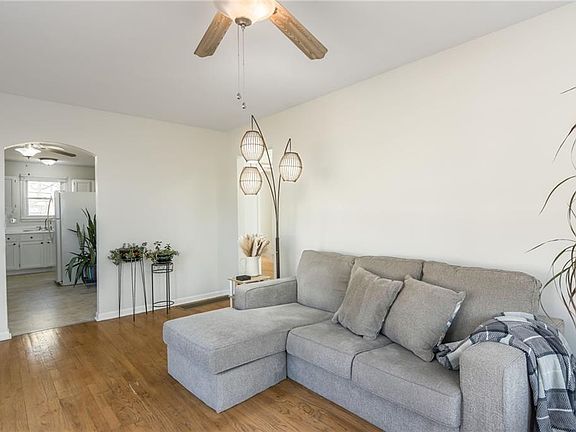 This adorable 2 bedroom 1 bath house is ready to go! You will love the wonderful curb appeal, freshly painted front door, and new mulch. Walk into the spacious living room, new vinyl blinds throughout, wood flooring, fresh paint, and so much natural light. The sparkling clean eat-in kitchen boasts a refrigerator, stove, and microwave that stay with the house. The seller has purchased Luxury Vinyl Tile to update the kitchen floors. Covered deck right off the kitchen offers a perfect view of the huge backyard. 2 nice-sized bedrooms with ample closet space, ceiling fan, and fixtures. Newly updated bathroom with luxury vinyl tile. Unfinished basement with 1 car garage, laundry area, washer & dryer stay with the house. Plenty of storage space including nice built-in shelving. Very well-maintained home. Walking distance to schools, shopping, and easy highway access. Come take a look!