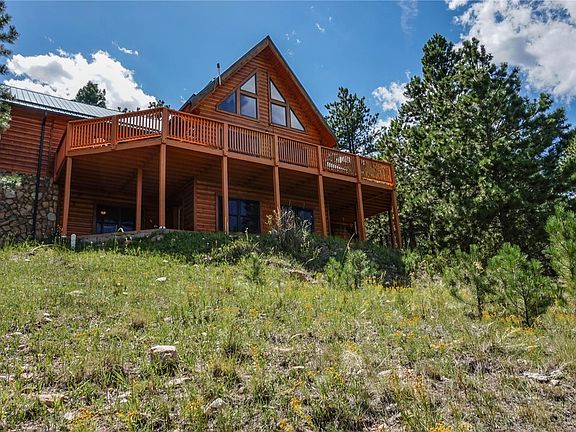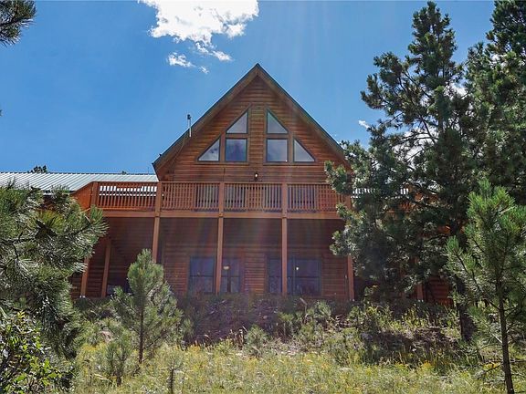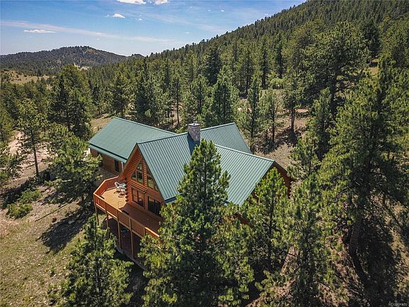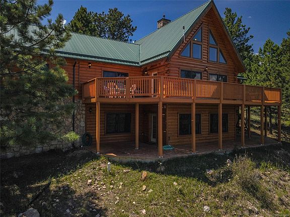 This spectacular log home boasts 3 spacious bedrooms, 3 bathrooms, and sits upon 35 acres of Colorado beauty with awe inspiring views. Fire up the pellet stove and gaze out of the expansive windows as the wildlife roam your land. The main floor hosts a large master bedroom and bathroom with the closet we all dream of, an additional bedroom, bathroom, large office, living room and a large open kitchen. Meander down to the finished walk-out basement where the sun shines upon you from the custom doors and windows. Entertain your guests from the wet bar, and additional living room/ game room. You will also find an additional bedroom and bathroom in the finished basement. This home was custom built to last, with loving touches, and upgrades throughout. Gorgeous wood floors, wood beams throughout, rock chimney and stunning log features. Home on a good well with a cistern for back up storage. This is the mountain retreat you are dreaming of.