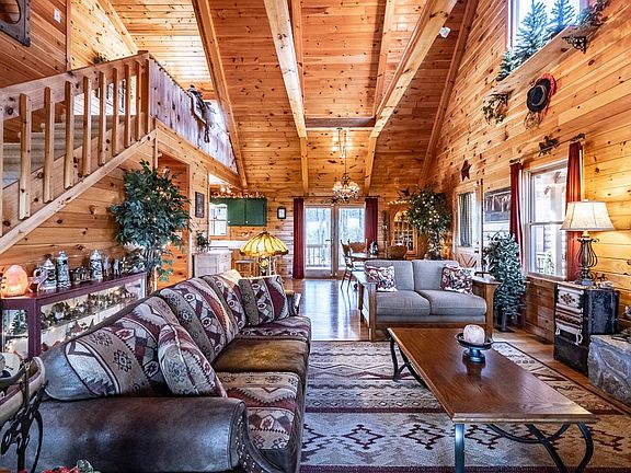 IT'S A GOOD DAY TO BUY A HOUSE IN THE MOUNTAINS! LIVE IN A "MILLION DOLLAR" NEIGHBORHOOD FOR LESS THAN $500,000. In an Article in the Wall Street Journal, May, 2018, an interviewee, stated, they were thinking about a move, but didn't know where to go, until they visited Blue Ridge last year. "Blue Ridge forces you to wind down, the draws include, moderate weather, lack of traffic and low costs of everything from property taxes to restaurants." LOCATED IN DESIRABLE "MOUNTAIN TOPS" . "Mountain Tops" is just across the 4 lane from downtown Blue Ridge. Once you pass under the portico into "Mountain Tops", the busy world gives way to mountain living. It is only a 2 minute drive, on paved roads, from the entrance portico to 481 Pony Ghost Trail. The 4 bedroom, 3 bathroom, 2,805 sf cabin, with city water, sits at just under 1900 feet elevation, with a spectacular views, with 5 porches. Garage and fireplace porch added in September 2015. Big front and back yard. Several "Million Dollar" homes around us. First Floor Great Room w/gas fireplace 30ft x 16ft Kitchen w/instant hot 12ft x 8ft 2nd Bedroom 12ft x 13.5ft Bathroom (ensuite) 14.5ft x 5ft 3rd Bedroom (office) 10.5ft x 13ft Walk- in Pantry 3ft x 4.5ft 2nd Floor Master Bedroom 18ftx 15ft Loft 14.5ft x 7ft Master Bath 9ft x 13ft Master Bedroom closets 5.5ft x 2ft & 7ft x 2ft Screened porch 15ft x 10ft Lower Level 4th Bedroom (TV room) 17ft x 14ft 3rd Bathroom 9.5ft x 5ft Game Room 14.5ft x 14ft Movie Theatre Room 14ft x 14ft Utility / craft Room 15.5ft x 14ft Garage 2 car garage 24 x 28 Work benches Stairway to walk around attic Outside Living 16 ft x 32 ft Covered Porch w/ wood burning fireplace Stairway to lower level Pergola with firepit. East/ West facing view on 1.20 acres Whole house central vacuum system Theatre Room w/ 100 inch Screen and Surround Sound Wall safe Being sold mostly furnished. The community of "Mountain Tops" offers city water , an active HOA and High Speed Internet. The new standalone, University of North Georgia, Blue Ridge campus is scheduled to open in 2020.