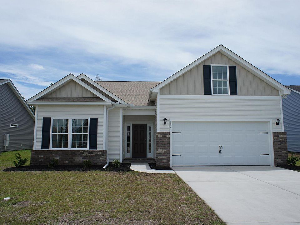Beautiful Hatteras floor plan in the new Ocean Palms community, currently under construction. This terrific open floor plan, 4 bedroom, 3 full bath home will have grey wood-look LVP flooring in the family room, kitchen and dining area, under the soaring vaulted ceiling, and comfortable carpet in the bedrooms and bonus room. Stainless appliances, staggered-height Shaker-style grey painted cabinetry, granite counters and a convenient breakfast bar combine to give you the wow factor you're looking for, and abundant recessed lighting plus two large windows in the adjacent dining area flood the room with light. A French door in the great room leads to the covered rear porch and the large separate patio beyond. The spacious master retreat features a long vanity, an oversized walk-in shower, plenty of storage in the linen closet and a huge walk-in closet, plus a tray ceiling. Two additional bedrooms and a full bath are tucked off on their own hallway, for privacy, with another bedroom and bath upstairs in the bonus room. All of the homes in Ocean Palms come standard with the luxury of natural gas (tankless water heater, gas heat, and gas range). The two car garage is completely trimmed and painted. Ocean Palms is conveniently located near shopping, restaurants, schools and world class medical offices and hospitals, and only a short golf cart ride to Surfside Beach's gorgeous beach and the beautiful Atlantic Ocean. Other floor plans and inventory homes may be available, and CUSTOMIZATION OF FLOOR PLANS IS POSSIBLE!!! Community Pool and Cabana Coming Soon! Photos are of a completed, similar home and may have different features.
