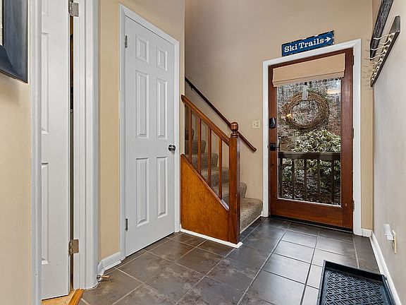 Ski chalet-style with upstairs loft bedroom and bath. Downstairs primary bedroom, bathroom with walk-in shower, living/dining space with wood-burning stacked stone fireplace. Fully equipped kitchen, full-size stacked washer & dryer.
