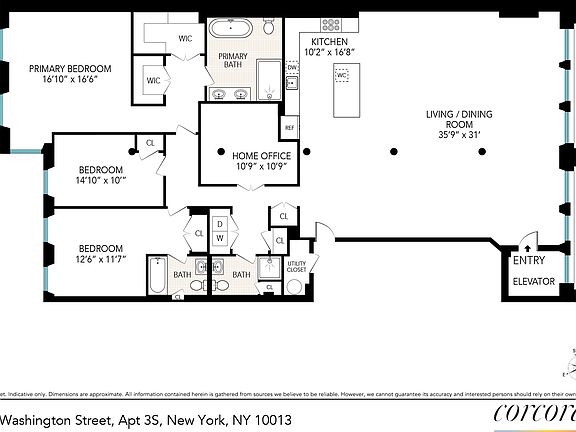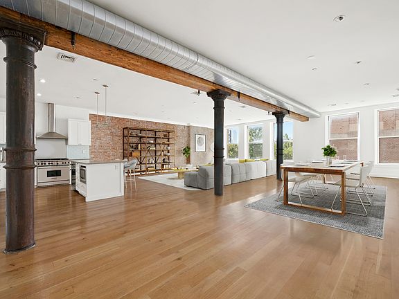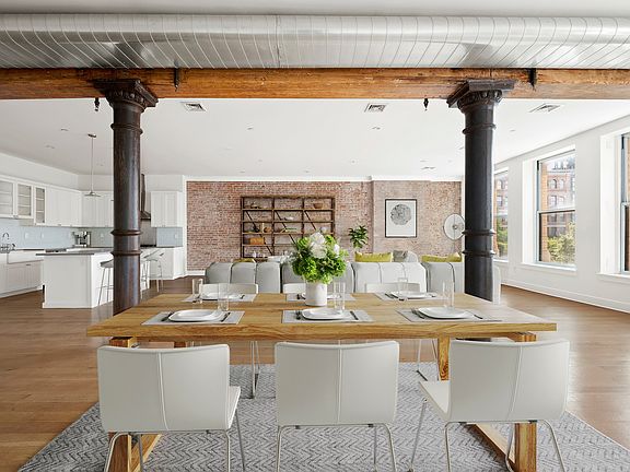 Historic loft details meet contemporary updates in this three-bedroom, three-bathroom Hudson Square residence featuring a large home office, expansive layout and sun-kissed living space in a fully renovated prewar condominium. Inside this nearly 3,000-square-foot home, 10-foot-tall ceilings are supported by original timber beams and cast-iron columns, while 11 oversized windows frame glorious natural light and open-sky views. Keyed elevator access welcomes you inside a sprawling great room featuring white oak floors, exposed brick, wonderful western outlooks, and a generous footprint for seating and dining areas. The open kitchen impresses with abundant Shaker cabinetry, a center island/breakfast bar and upscale stainless steel appliances and a wine refrigerator. Bedrooms are placed at the rear of the home for optimal peace and privacy. Head to the primary suite to discover a king-size layout, double exposures and two custom walk-in closets. The en suite spa bathroom features a large glass shower, freestanding soaking tub, and double console vanity surrounded by Carrara marble tile and radiant heat flooring. A secondary suite boasts a reach-in closet and a private bathroom, while the third bedroom enjoys easy access to the home's full guest bathroom. This home's huge home office could easily serve as a nursery or guest space. Central HVAC, additional closets, and a laundry closet with an in-unit washer-dryer complete this turnkey Hudson Square sanctuary. The Spice Warehouse at 481 Washington Street is a handsome Beaux Arts building constructed in 1895 and converted to condominium use in 2013. The building offers exceptional privacy with just 12 units total and only two apartments per floor. Residents enjoy thoughtful amenities, including Monday through Friday daytime doorman service, virtual doorman access, a secured package room, a storage room and a bike room. This exceptional Hudson Square location is surrounded by the best of Downtown living, with SoHo, Tribeca, the West Village and Greenwich Village all within easy reach. Grab groceries at the Hudson Square Trader Joe's, SoHo's Gourmet Garage or Tribeca's Whole Foods. Meet friends at dozens of world-class local bars like the Ear Inn or North Bar, restaurants and fitness boutiques, and explore 550 acres of riverfront open space and recreation at Hudson River Park just one block away. Tech and media headquarters, including Google and Disney, round out this sought-after enclave. Transportation is easy with 1 and A/C/E trains, excellent bus service, CitiBikes, West Street and the Holland Tunnel all nearby. Upfront costs include first month rent, one month security, and condo application and move in fees.
